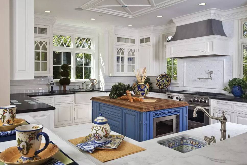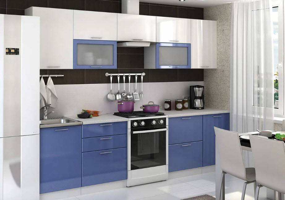 Красивая кухня с голубыми фасадами и белым потолком