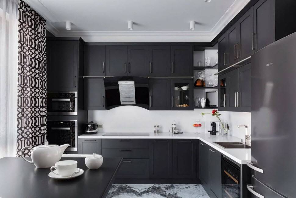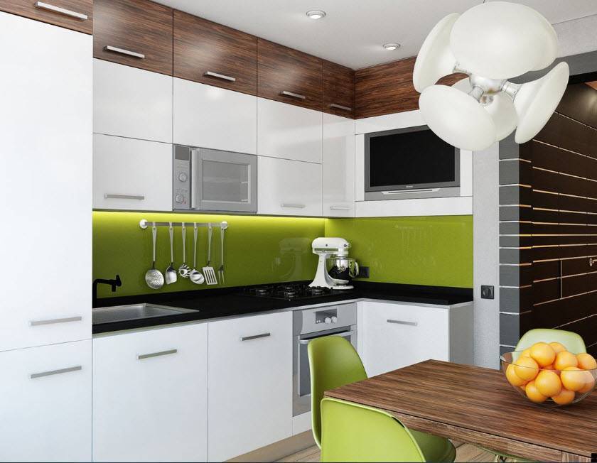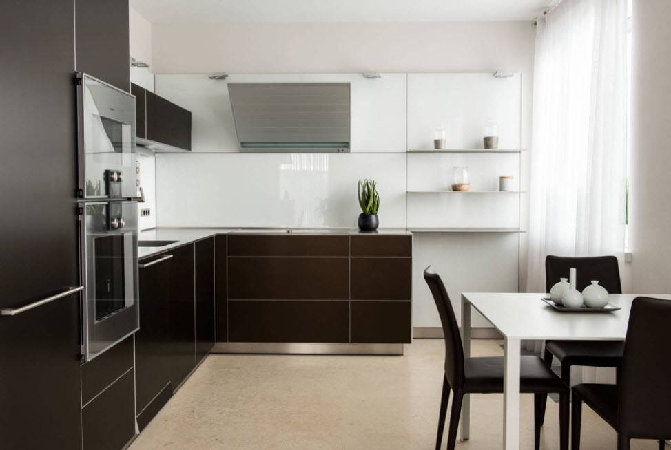 Несмотря на то что темный цвет довольно редко применяется при оформлении интерьера малогабаритной кухни, смотрится он поистине шикарно