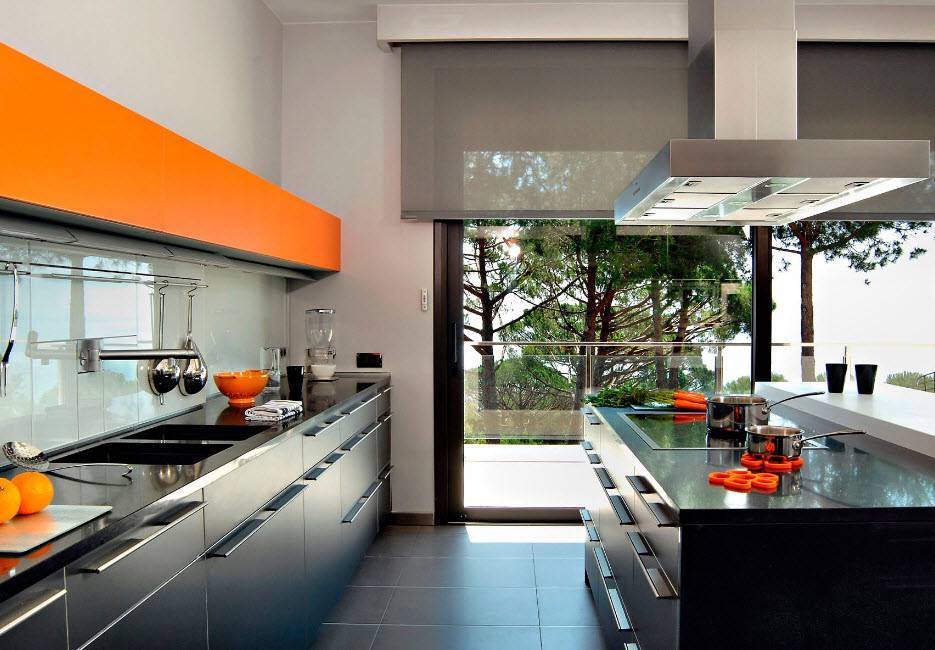 Хай-тек – современный стиль, позволяющий создать комфортную и многофункциональную кухню. Для оформления используют компактную мебель, основной акцент делается на ультрасовременную бытовую технику. Основной акцент здесь делается на обилие стекла и металла, глянцевых поверхностей с четкими линиями.