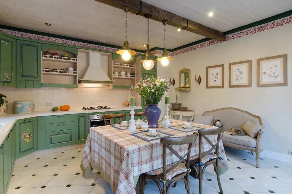 Прованс – романтический стиль, для которого характерны цветочные узоры и растительные мотивы, грубая отделка потолка и светлая мебель. Данное решение прекрасно вписывается в рамки загородного дома, дарит ощущение деревенского уюта.