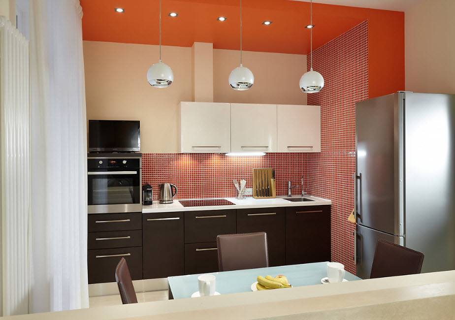 Наиболее востребованным вариантом отделки потолка небольшой кухни остается штукатурка с последующей побелкой или покраской. Тщательно выровненные плоскости смотрятся выигрышно, а материал не снижает высоту комнаты.