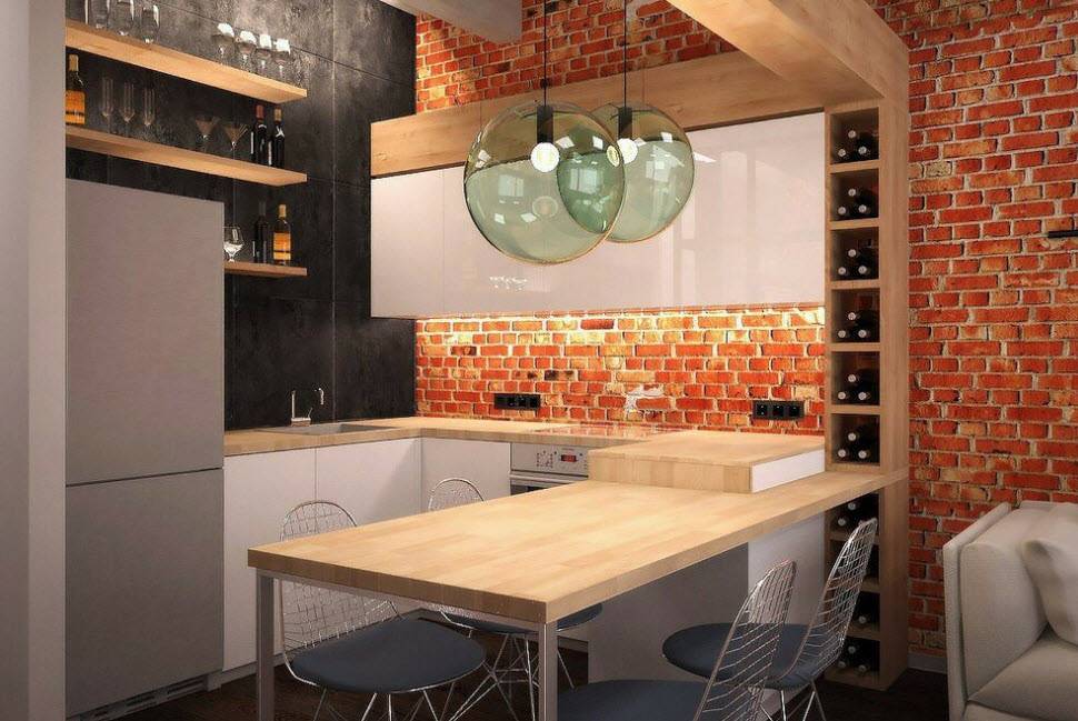рабочий стол уложен керамической плиткой,опирающийся на голую кирпичную кладку с нишами под встроенные деревянные шкафы в них, удобно и практично