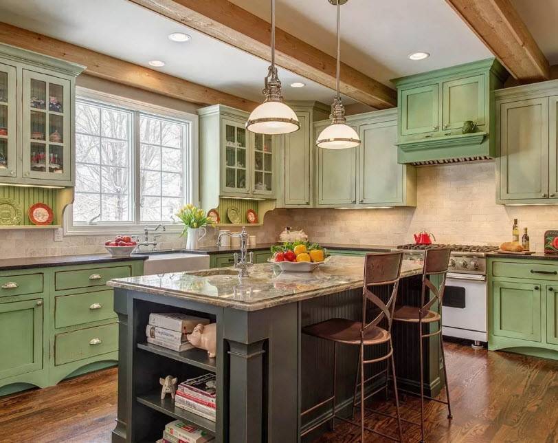 Кантри – еще один стиль, создающий комфортную деревенскую атмосферу. Для оформления используется древесина и камень, пастельные тона (оливковый, песочный, бежевый). Основной акцент делается на простоте, изысканного и дорогостоящего декора здесь нет.