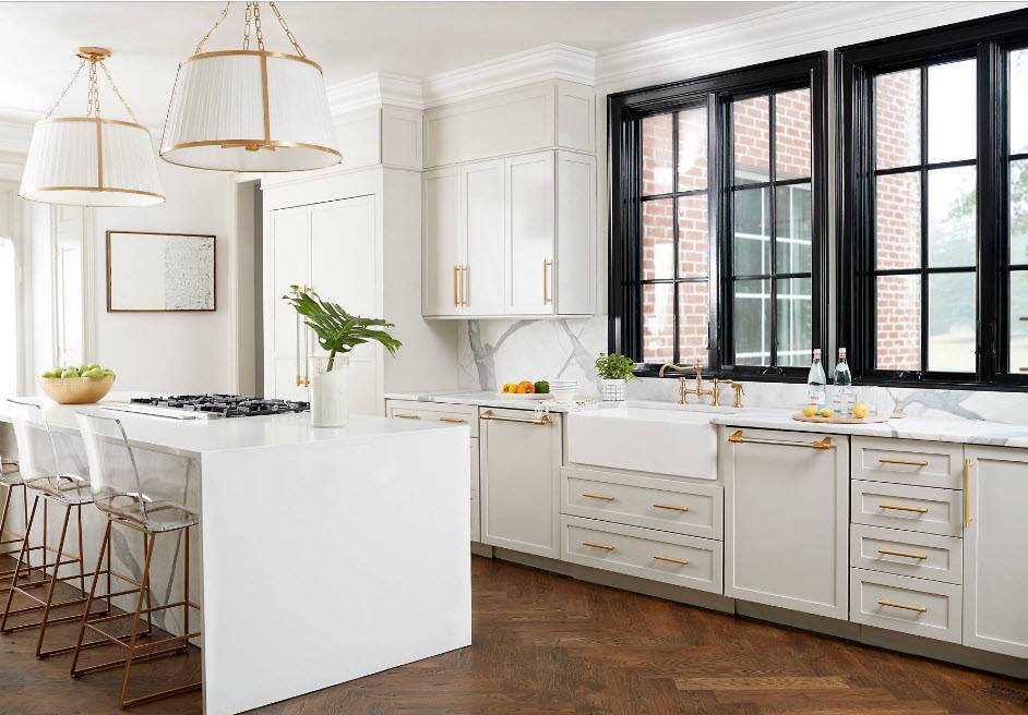 Стильный интерьер компактной кухни в белоснежной гамме