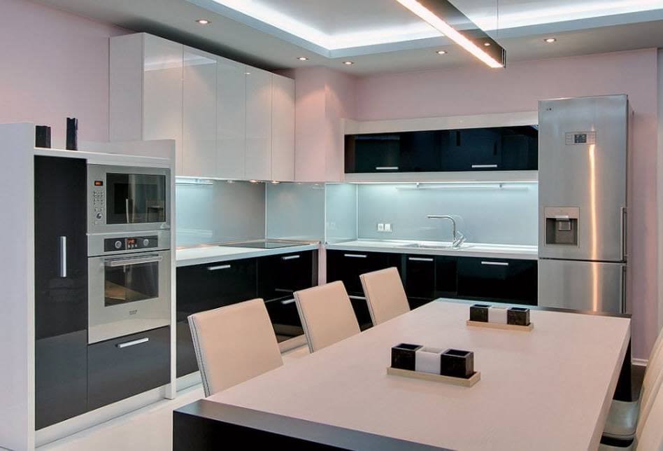 Тщательно продумайте освещение. Оно должно быть многоуровневым и акцентным. Откажитесь от большой люстры — точечное освещение на глянцевом потолке, добавит помещению объема и высоты. В зоне приема пищи над столом можно расположить светильник на длинном шнуре. Это выделит столовую зону.