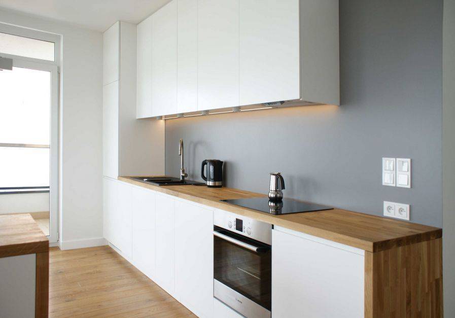 Совет: для кухни небольших размеров лучше заказать гарнитур с компактными шкафчиками глубиной не более 60 см. У двух смежных стен может размещаться мебель разной вместительности: более просторные подойдут для техники, менее вместительные – для продуктов и кухонной утвари.