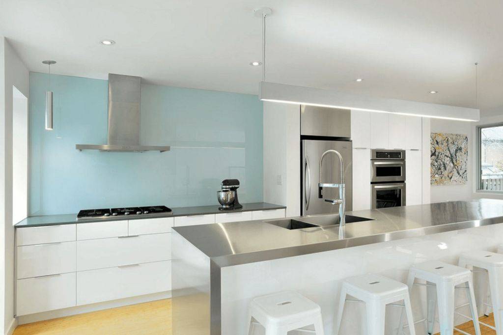 Стена над столешницей может быть отделана однородными обоями, закаленным стеклом, кирпичом, архитектурным бетоном или традиционной плиткой. Имея в своем распоряжении всю стену, можно также может подумать об интересной графике или картинах.
