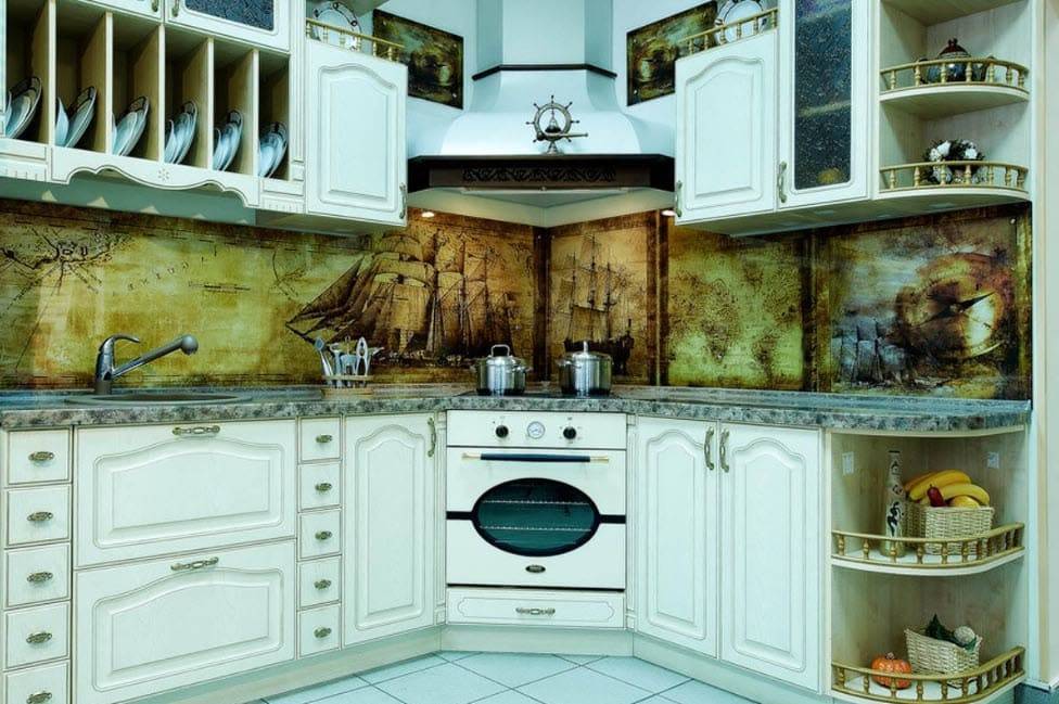 Если помещение просторное, то желательно верхние шкафы установить только по одну сторону угла, а вторую сторону украсить, например, картинами или повесить полочки. Вторым вариантом станет использование с другой стороны шкафов-пеналов, в которых будет находиться встроенная техника.