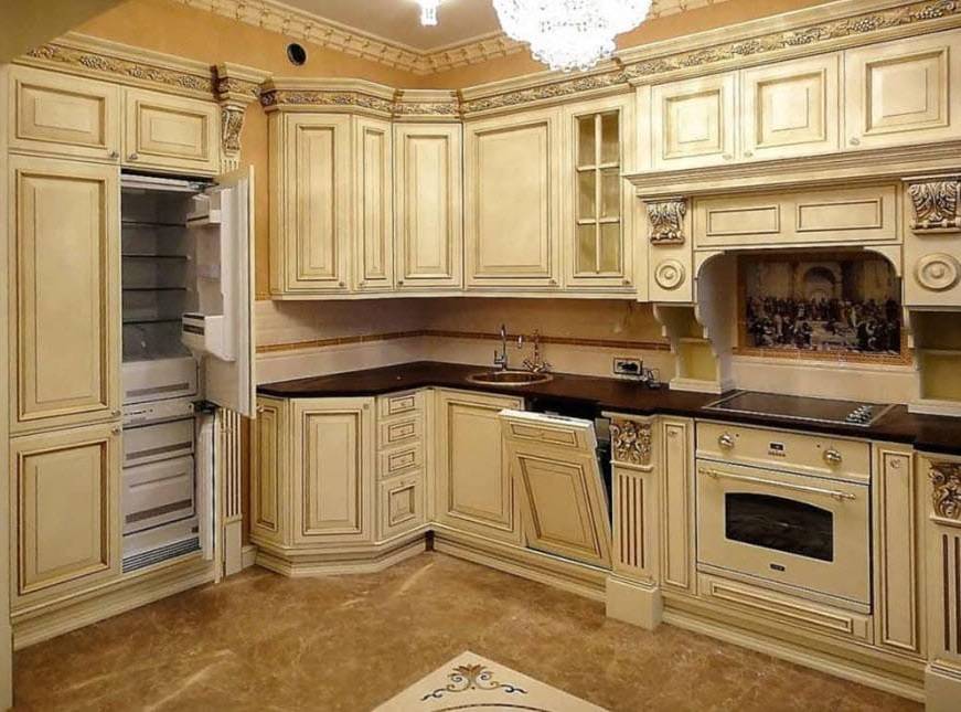 Бежевая кухня 6 кв.м. ценой 3200$ со встроенным холодильником. Не жалейте выносить дополнительные розетки – лишним не будет точно.