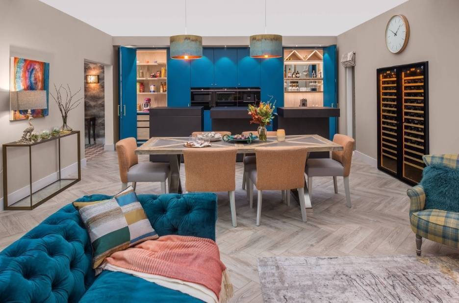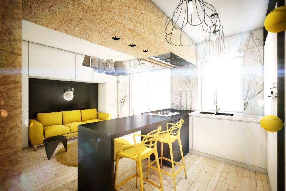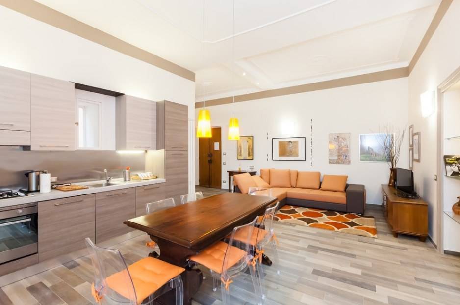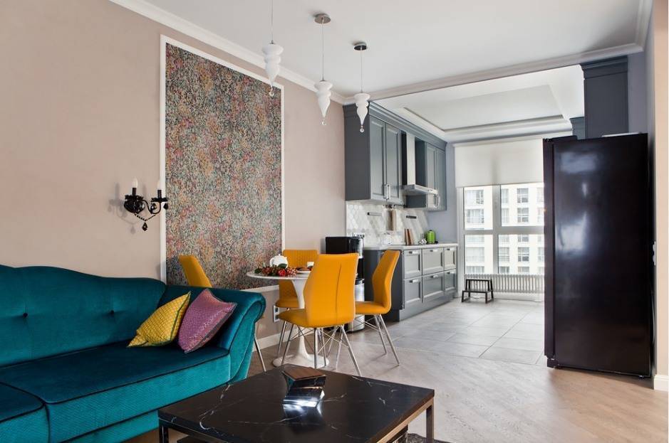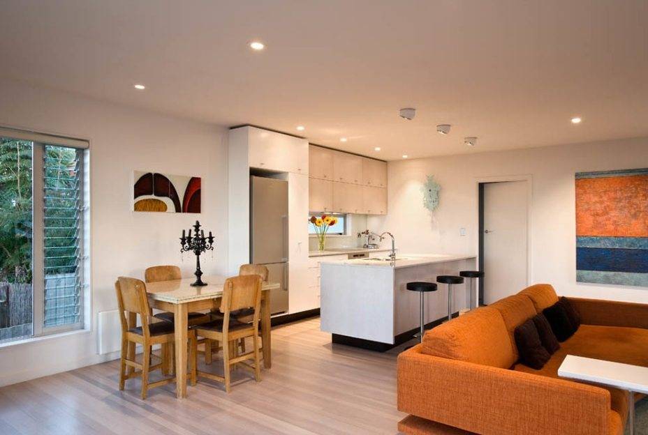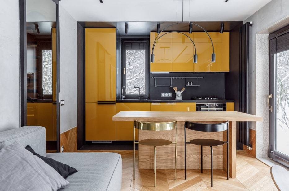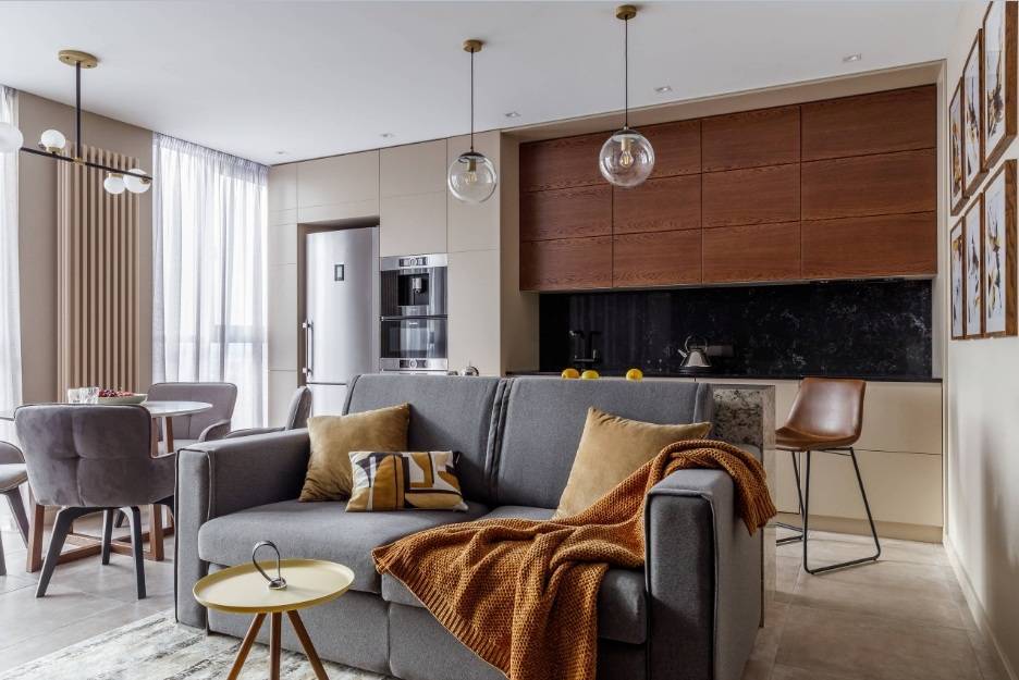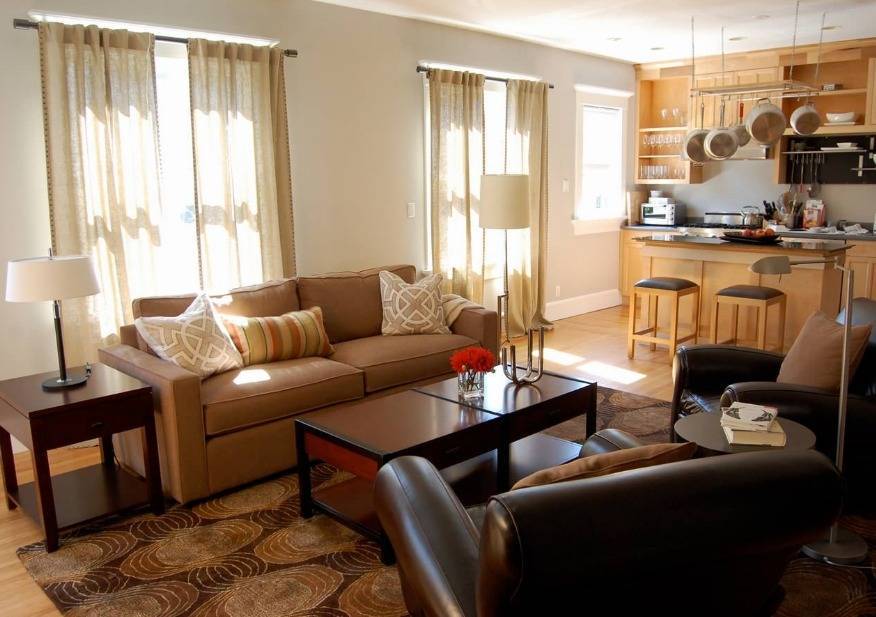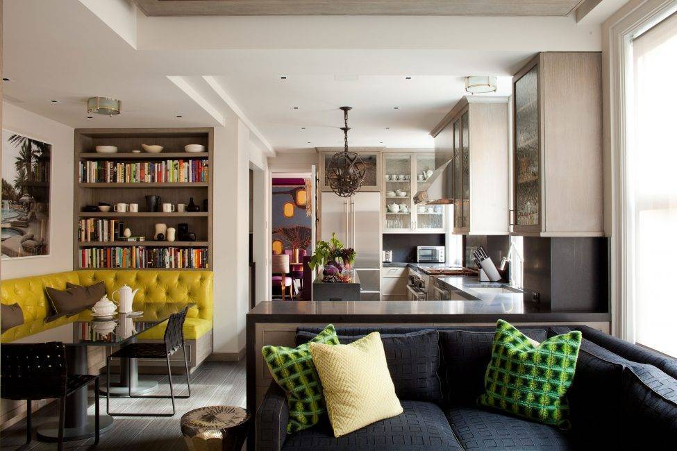 В гостиных и на кухне можно размещать мебель более ярких цветов, оживить обстановку помогут мягкие конструкции горчичного, красного и кукурузного оттенка. Чтобы они гармонично вписались в общую обстановку комнаты, их можно дополнить разноцветными подушками.
