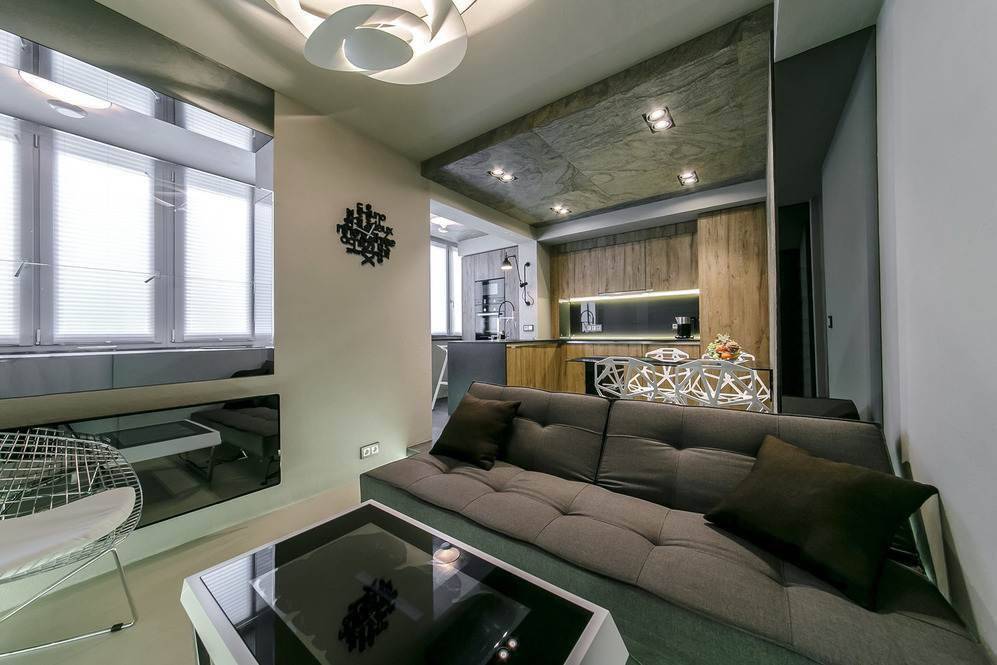 Небольшой диван-раскладушка днем служит местом отдыха или обеденной зоной, а ночью – дополнительным спальным местом.