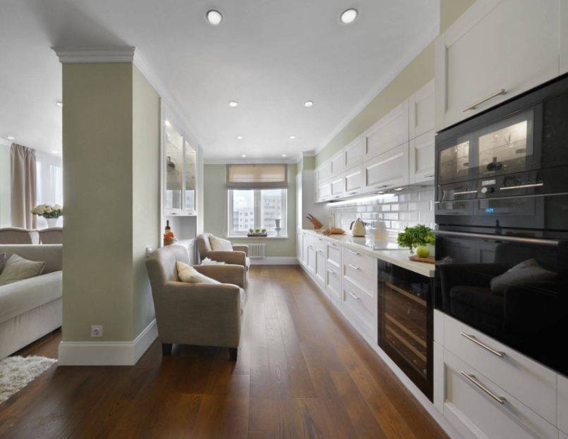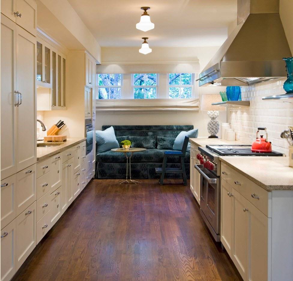 Небольшие прямые диваны гармонично смотреться на кухнях узкой планировки. Они бывают двух видов: со спальным местом и без него. Помните, что такие конструкции раскладываются по принципу «книжки» или выкатываться вперед. Второй вариант менее практичен, так как занимает много места в разложенном положении. Если у вас часто на ночлег остаются гости, стоит приобрести на кухню раскладной диван. Наиболее подходящей моделью станет «Евро – книжка». Ее механизм рассчитан на частое складывание и раскладывание. А под сиденьями есть место для хранения вещей.