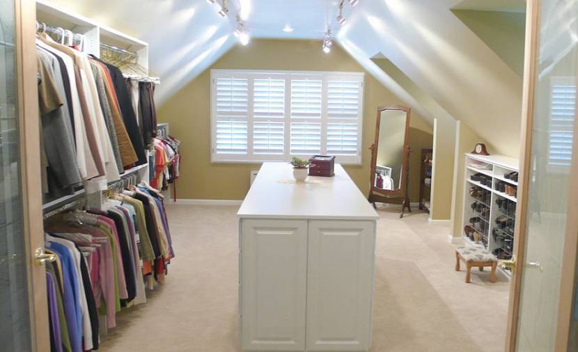 Очень часто, несмотря на достаточное количество окон и искусственных источников света, мансардные шкафы и гардеробные комнаты оборудуются дополнительной системой освещения. Такое техническое дополнение решает сразу две задачи: эстетическую и утилитарную — удобно, когда перед зеркалом имеется освещенная зона, да и нужные вещи легче искать на свету. Светильники устанавливаются врезным или накладным способом; по типу используемых ламп встречаются галогенные, светодиодные и люминесцентные светильники, а также светодиодная лента.