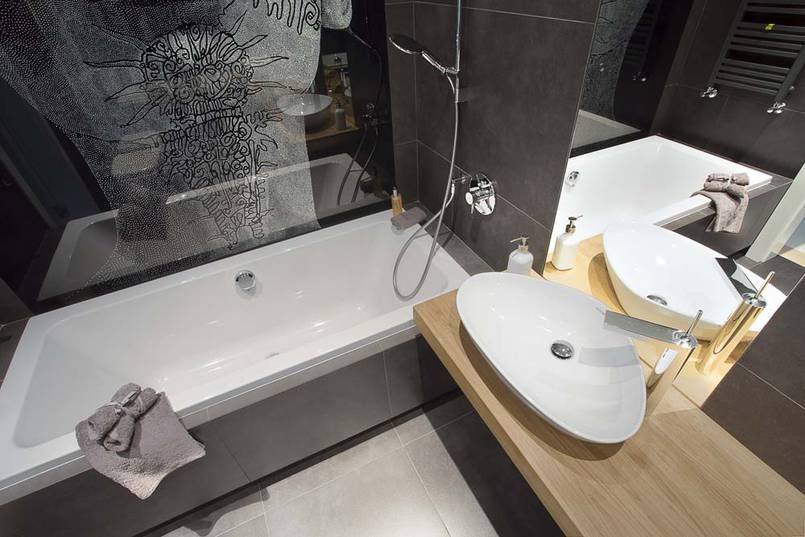 Если в ванной нет душевой кабины или душ находится за стеной, высоту плитки можно определить по раковине. Такая плитка будет своеобразным высоким панно, достигающим почти 120 см. Если цвет материала и стен над ним контрастный, стоит знать, что горизонтальное разделение поверхности, опускающееся чуть ниже половины высоты, визуально приподнимет интерьер, а чуть выше опускает.