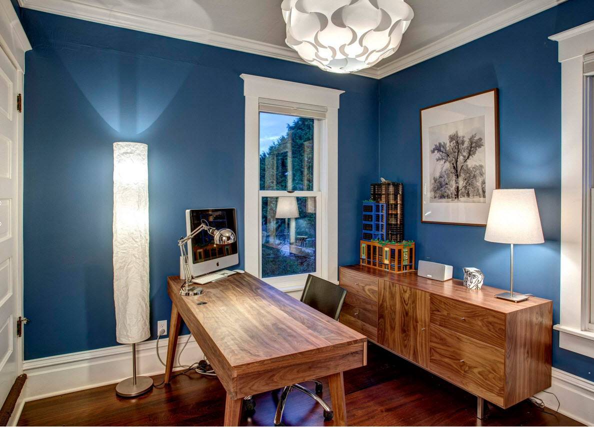 Синий способствует концентрации внимания. Красный положительно влияет на работоспособность. Зеленый поможет быстро настроится на работу и одновременно снимет напряжение. Все эти компоненты цветовой гаммы в компании с мебелью темного ореха являют собой идеальный вариант для комфортной обстановки в рабочем кабинете.