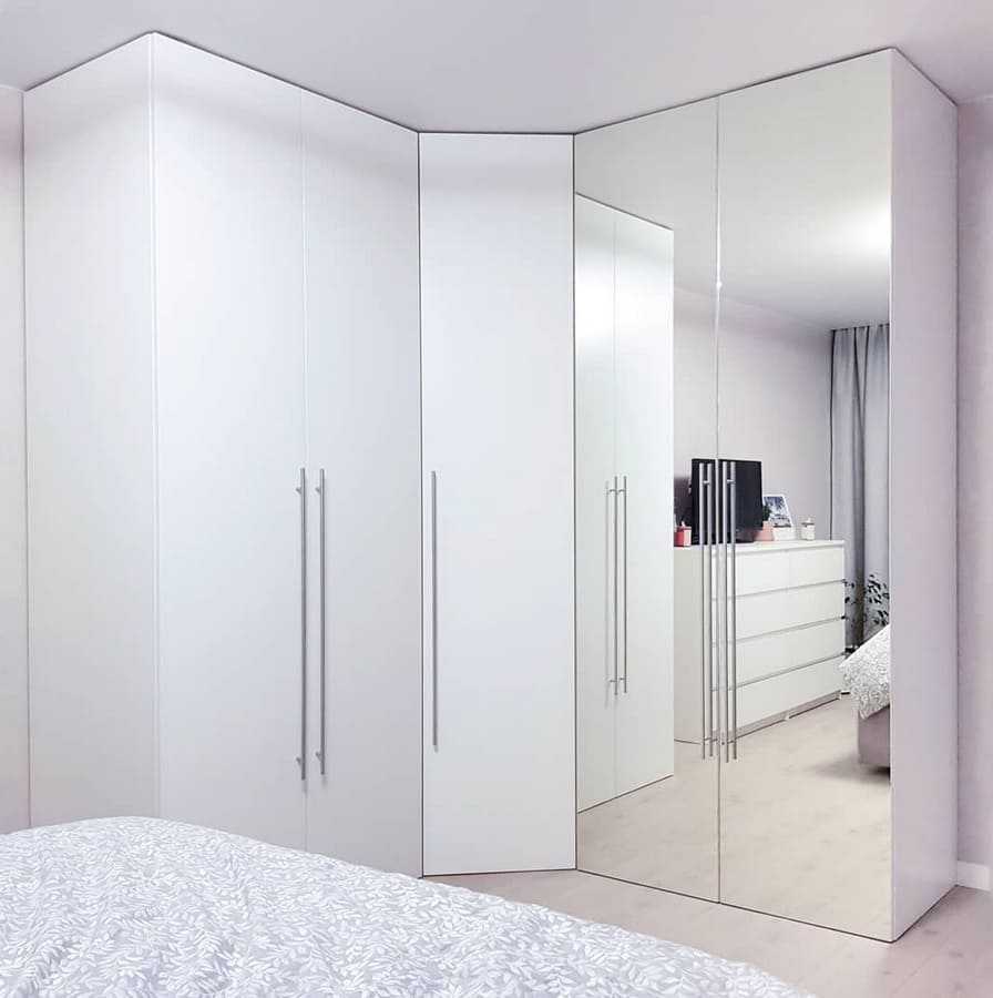 - Практичность. Размещение мебели в углу – отличный способ сэкономить свободную площадь. А выбор модели с зеркальным фасадом позволит отказаться от покупки массивного трюмо и зрительно увеличить объём комнаты.