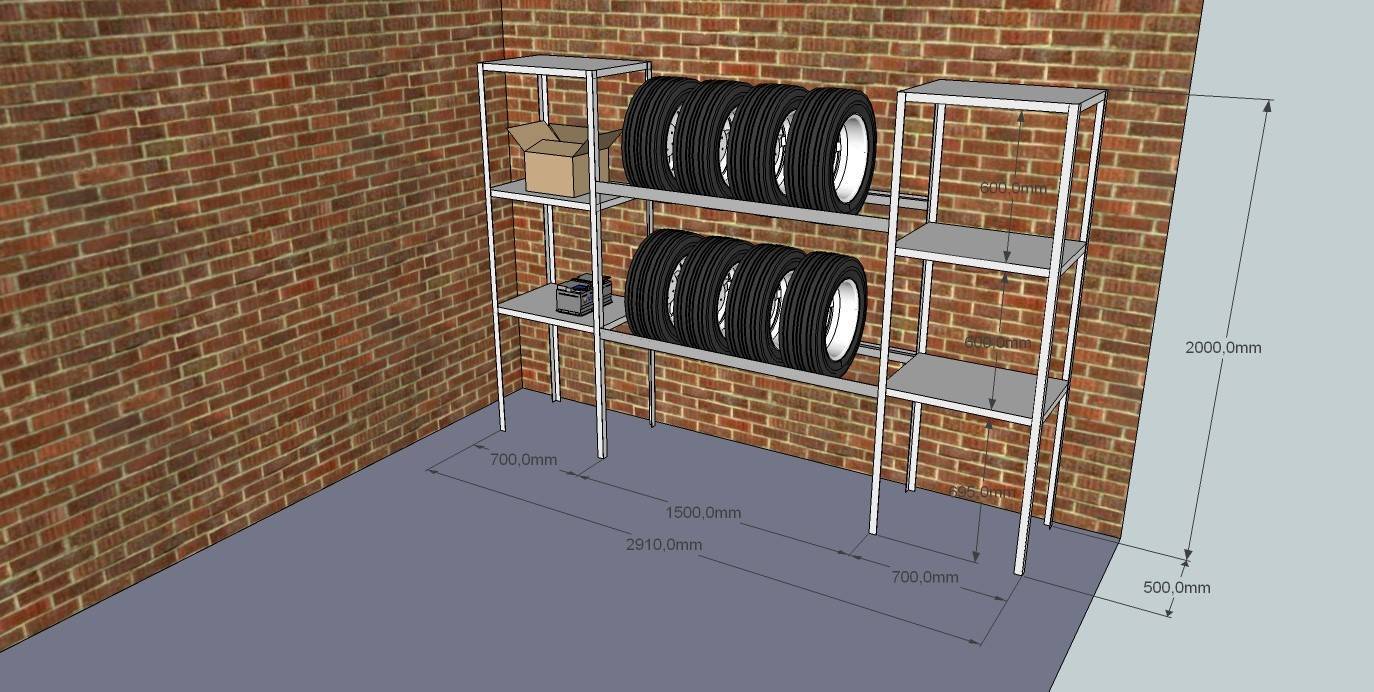 - Нижнюю полку приподнимают от уровня пола на 0,7 м и более. Это предоставит место для хранения запасной резины или канистр. Если колеса планируется хранить в гараже непосредственно на стеллаже, рассчитывают необходимый промежуток между полками.