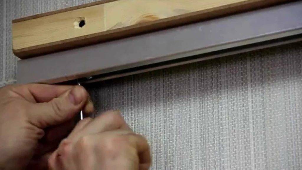 Требуется приложить полотно к готовому проходу с рамой и отметить линией верхнюю границу. К намеченной черте необходимо прибавить 0,7 см вверх и провести параллельную линию. Тут будет устанавливаться брус. Балку крепят саморезами. К нижнему торцу бруса будет крепиться рельс. Для этого применяют саморезы. Сначала рельс слегка фиксируют. Проверяют его прямолинейность. И только потом окончательно закрепляют.