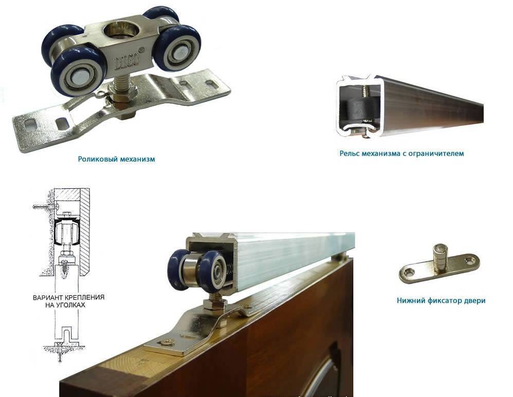 Чтобы створки не сошли с верхних рельсов, при монтаже используют стопоры. А появлению зазоров препятствуют специальные флажки. Основными достоинствами такого механизма являются: мягкое и тихое движение створок и высокопрочная система.