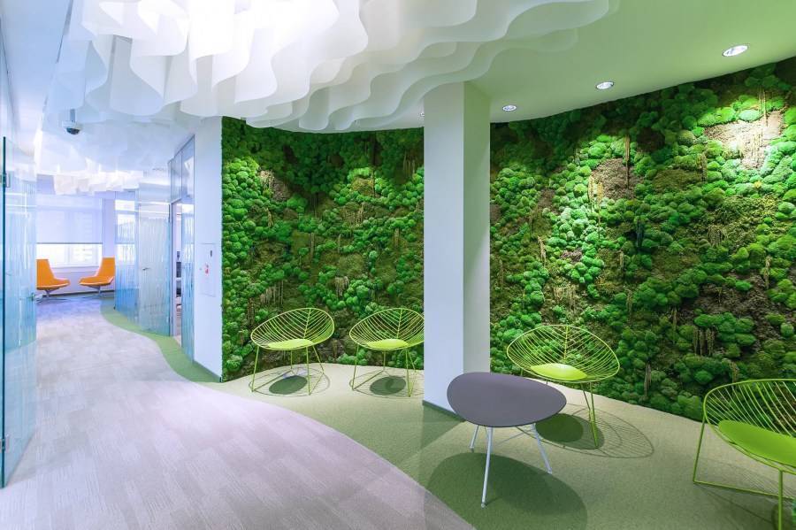 - Создать благоприятную атмосферу поможет мох и в рабочем кабинете. Им можно декорировать стену, создав воодушевляющую надпись или логотип.