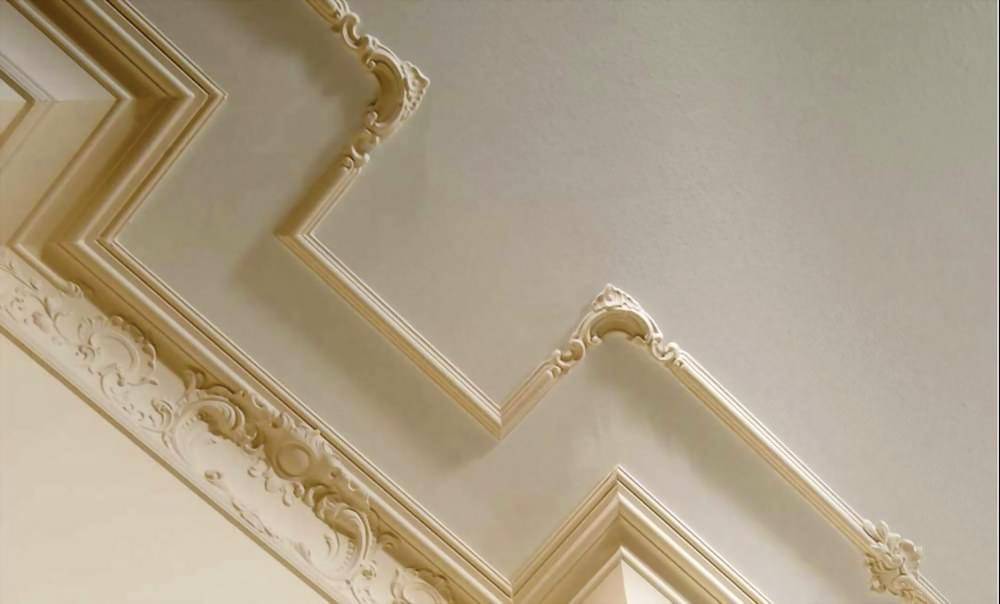 Чаще всего такие молдинги принимают форму карнизов, розеток, панелей, плинтусов, декоративных полос с геометрическими или цветочными мотивами. Также можно купить декор из полистирола с оригинальной лепниной и художественными узорами. Готовые элементы лучше монтировать на необработанную или неокрашенную штукатурку, или на неокрашенную гипсовую поверхность стен.