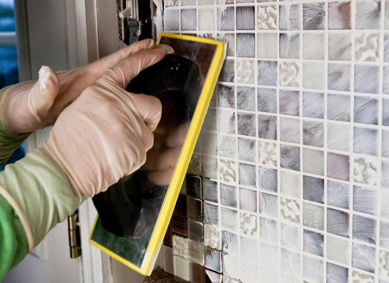 Удалите защитную плёнку (если есть). Шпателем начать затирку сначала по горизонтали, затем – по вертикали. Остатки убрать при помощи губки.