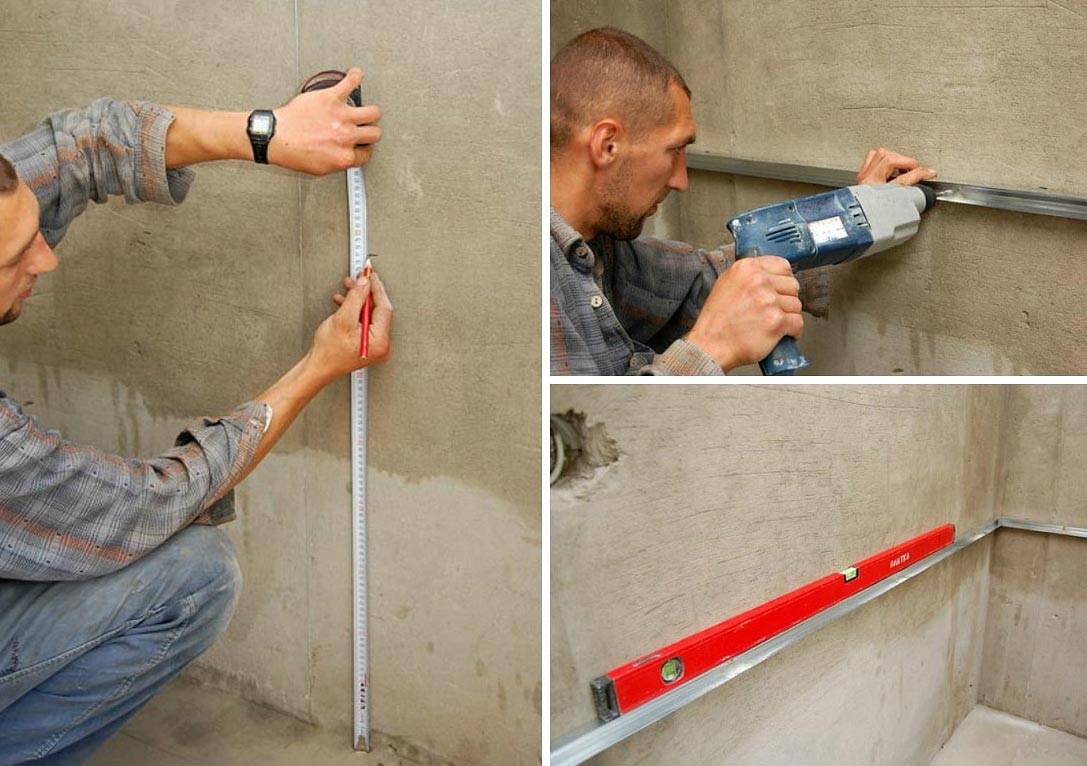 Разметка необходима для того, чтобы плитка легла ровными рядами. Разметка наносится карандашом с толстым грифелем или шнурком с гирькой, который крепится к потолку и обеспечивает идеально ровную линию.