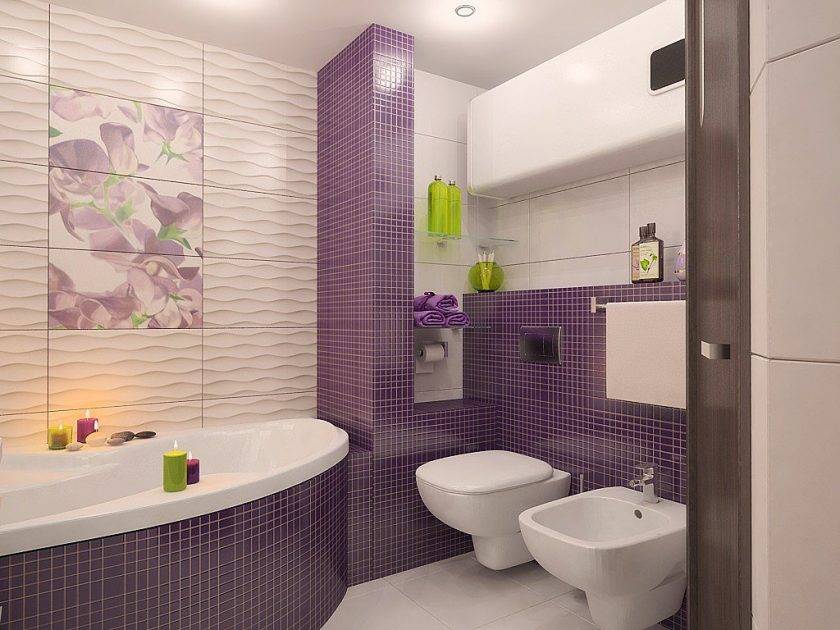 Если санузел не совмещенный, то дизайн для ванны с мозаикой, рекомендуется разбивать на зоны, подбирая панно. Мозаикой ванную комнату можно выложить разноцветными волнами. Мозаика благодарный материал и облицевать ею можно поверхность любой формы — круглой, овальной, что практично для помещения, где стены не отличаются абсолютной ровностью.