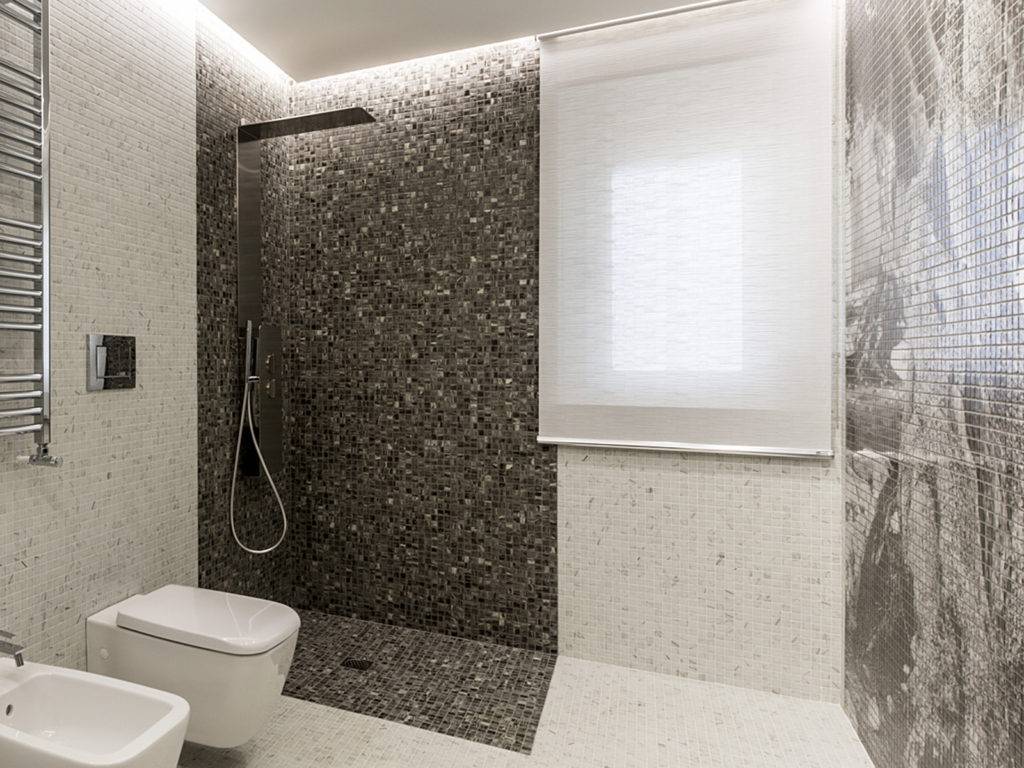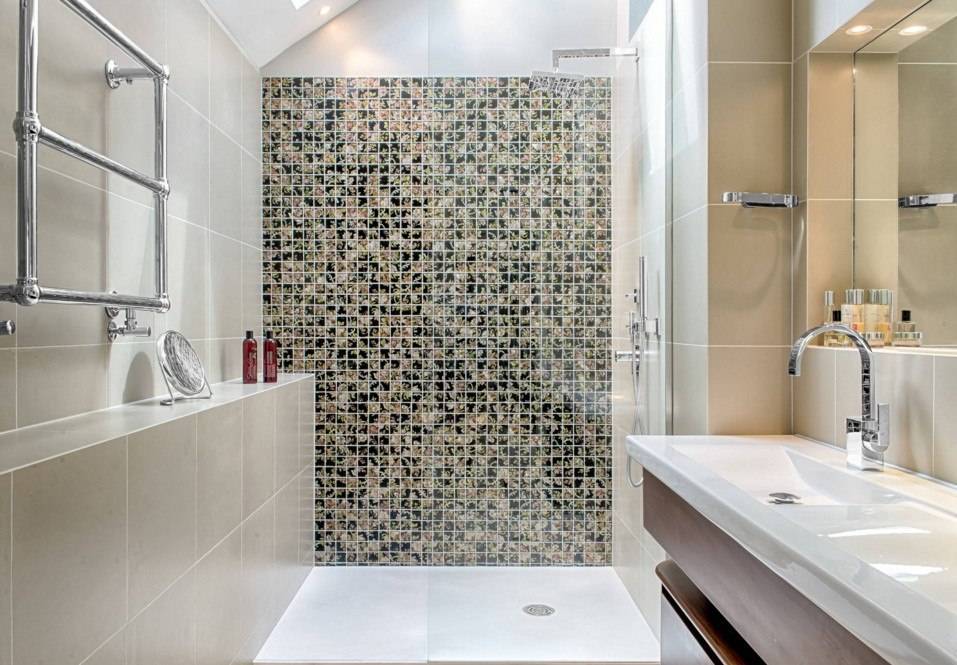 Мини-плиткой можно оформить пол рядом с душевой кабиной, поддон. Прочность придаст цементный раствор. Мозаичная отделка устойчива к влаге, долго прослужит.