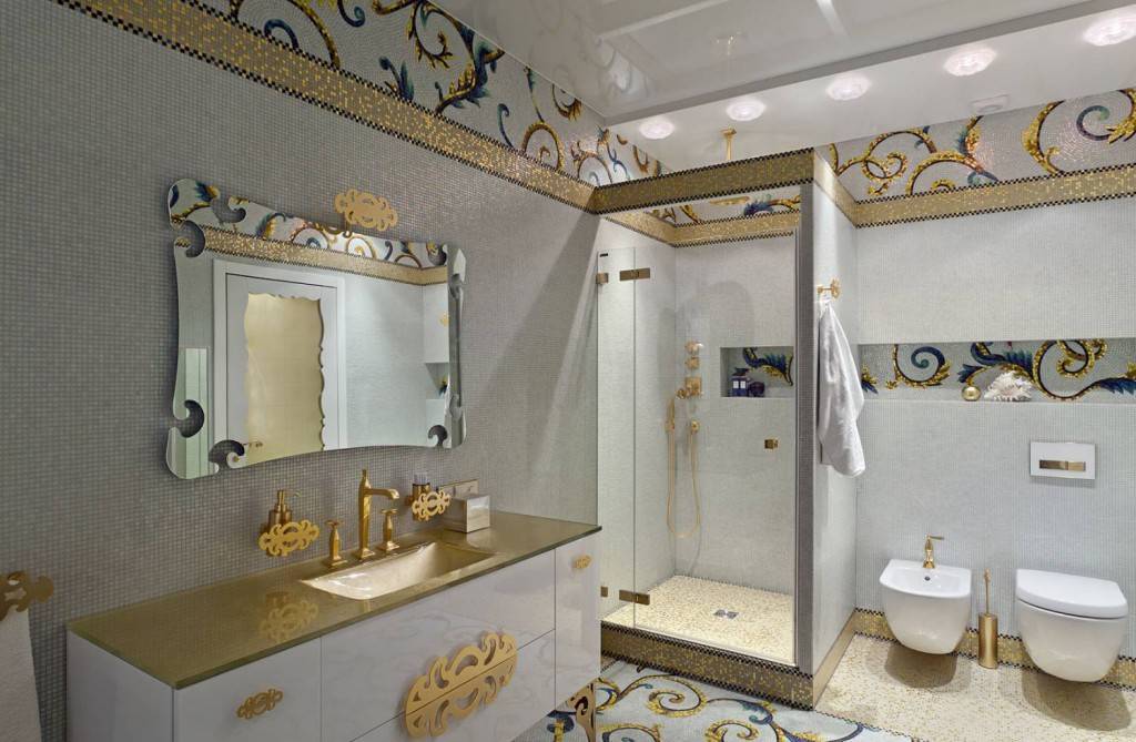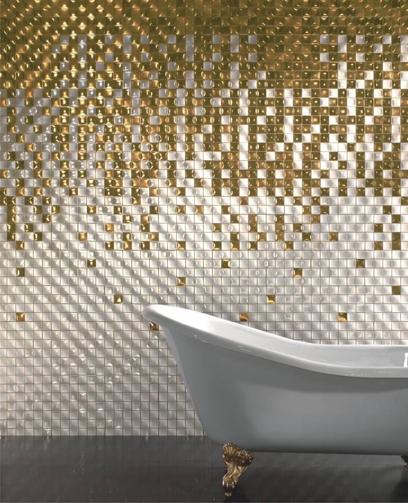 Золотые аксессуары — зеркальная рама, фурнитура и другие предметы декора подчеркнут этот эксклюзивный эффект. И хотя чрезвычайно впечатляющая золотая мозаика особенно подходит для интерьеров в стиле гламур, ее также можно найти в немного более аскетичных аранжировках, вдохновленных современным и индустриальным стилем (например, в мягких квартирах в мансарде).