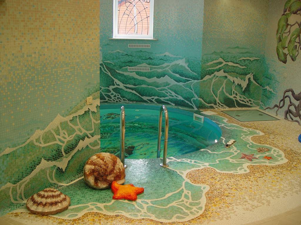 Морская гамма цветов с однотонной плиткой и подвесным глянцевым потолком, сочетается лучше всего. Мелкую мозаику в интерьере ванной лучше класть на стенах, на полу и ступеньках. Рекомендуемый дизайн эффектно смотрится с аналогичными цветовыми решениями при установке диодного или неонового освещения.
