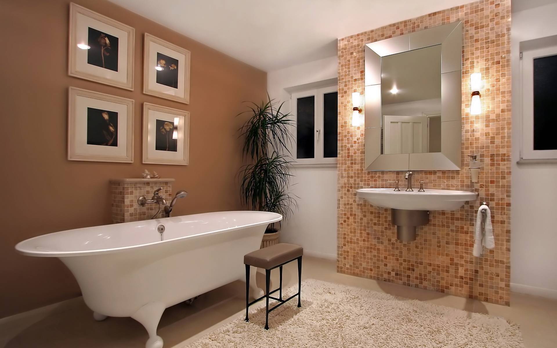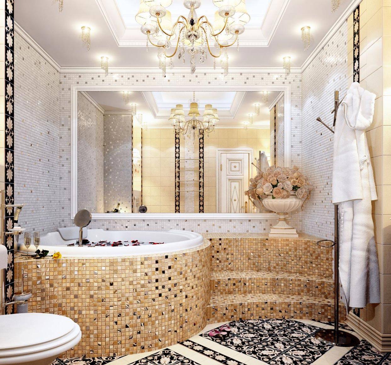 Традиционный ковёр замените на мозаичный. Лучше всего выложить мозаику по центру комнаты или возле ванны, душевой.