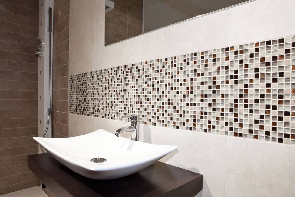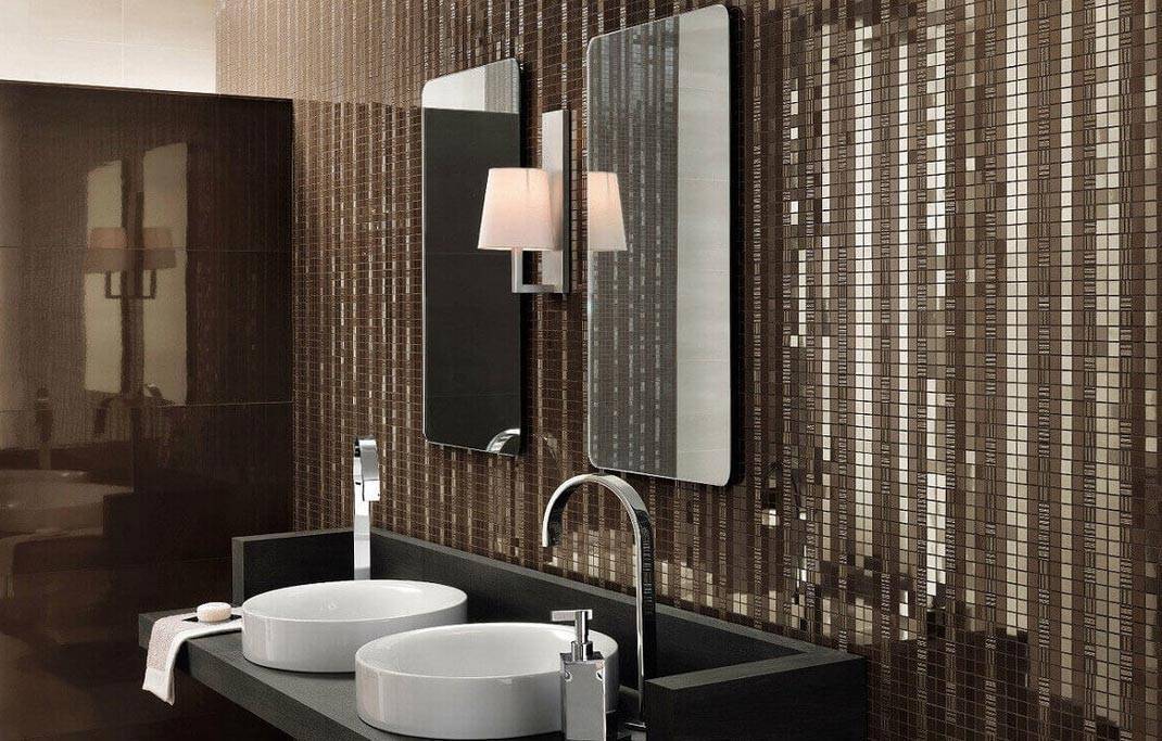 Оформление мелкой плиткой — мозаикой наиболее уместно в помещениях с повышенной влажностью и экстремальными перепадами температуры. То есть в санузлах, ванных комнатах и бассейнах.