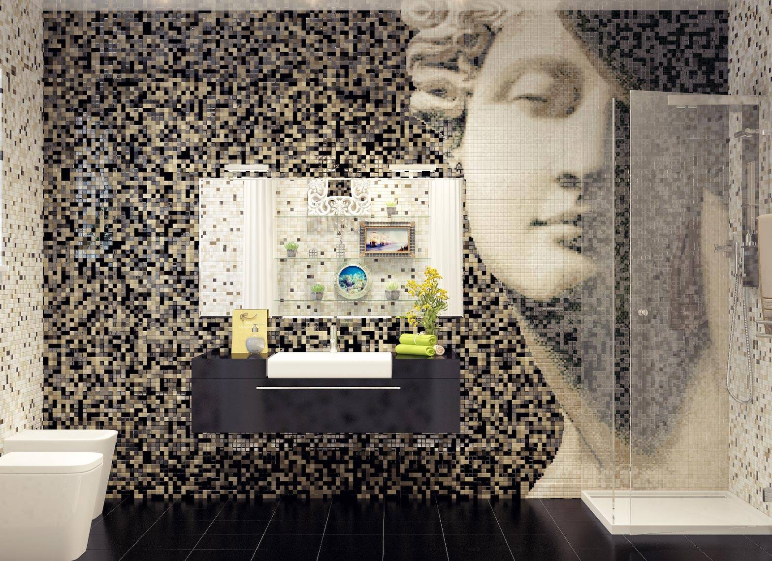 Оживите интерьер с помощью монохромных или контрастных мозаичных композиций, сочетающихся с окружающей обстановкой.