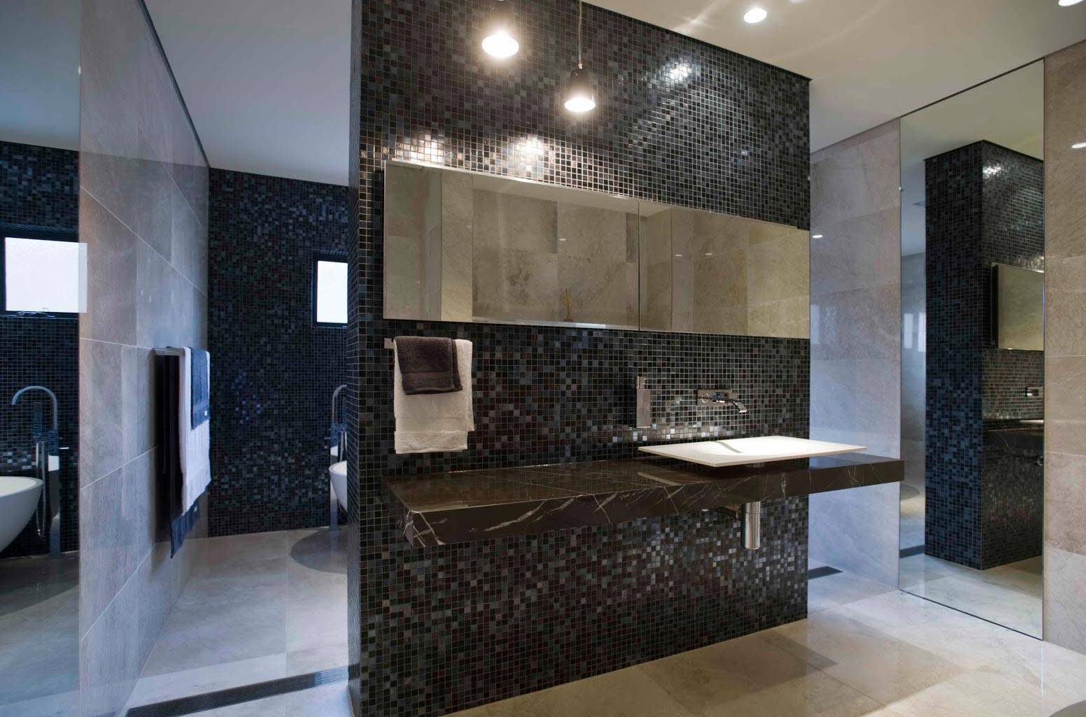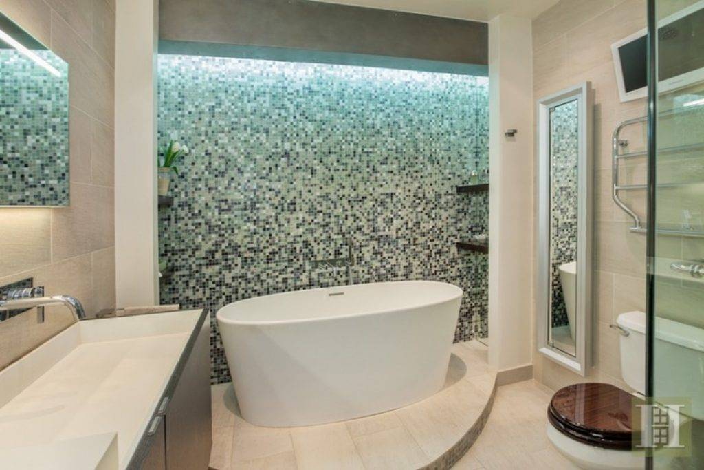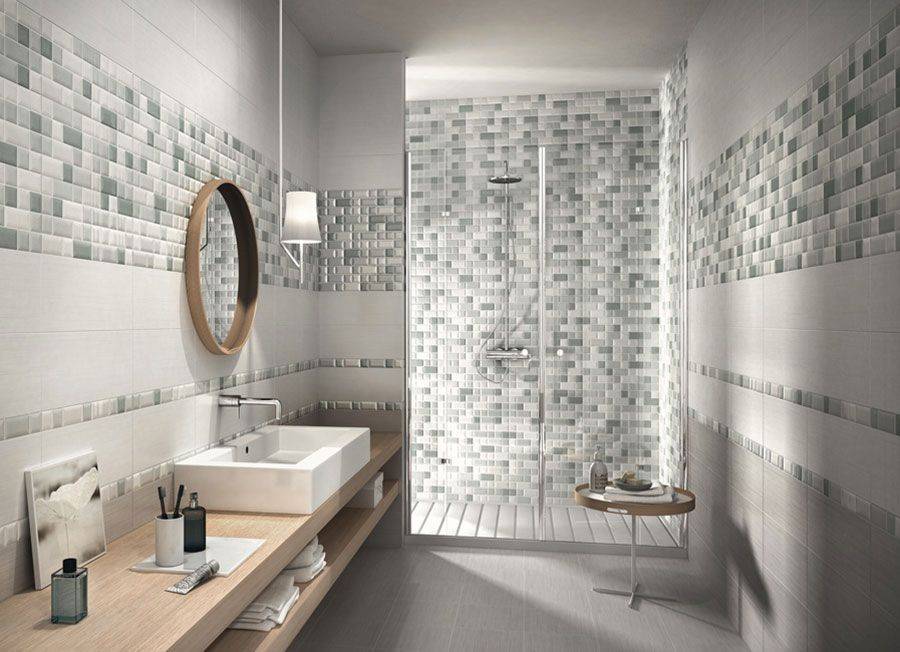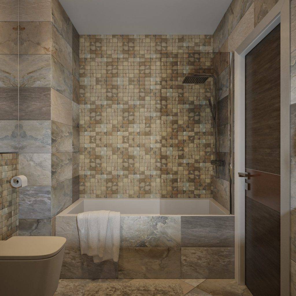 Дизайн ванной с мозаикой и полноразмерной плиткой