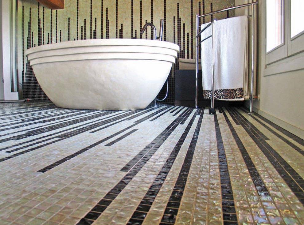 Украсить пол ванной мозаикой – нетрадиционное и интересное решение. Ковры и паласы уходят в прошлое, для ванной комнаты они не актуальны уже долгие годы, поскольку плохо впитывают влагу и быстро пачкаются.