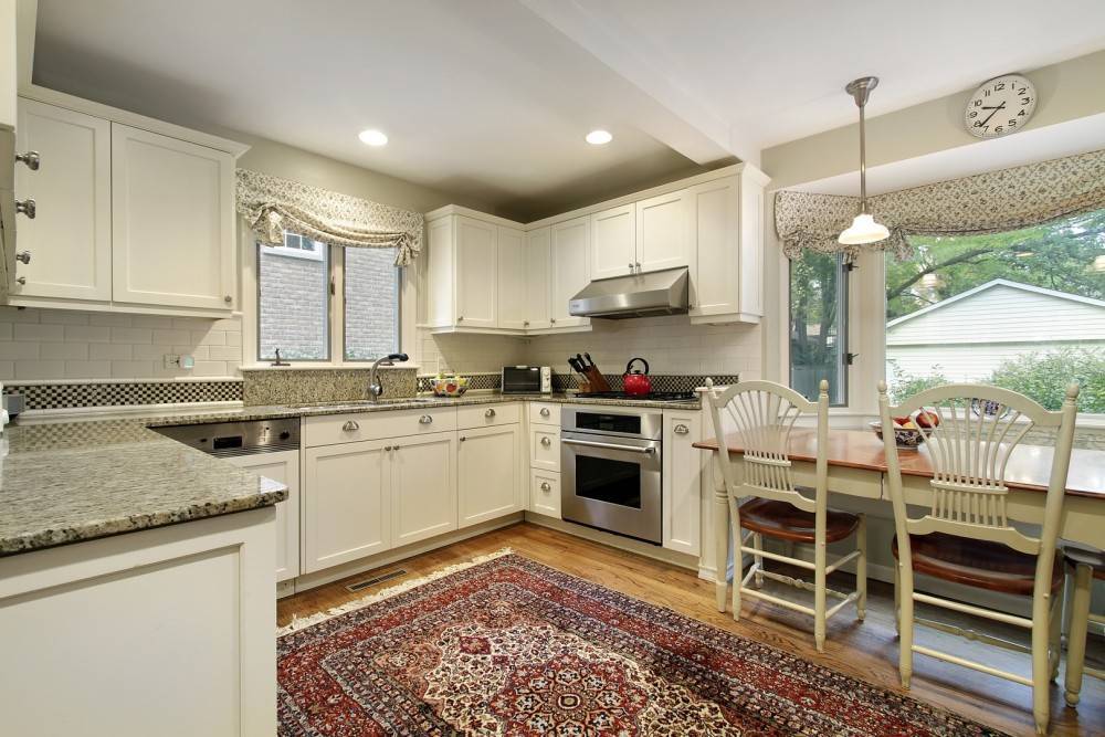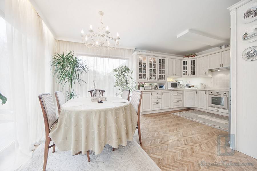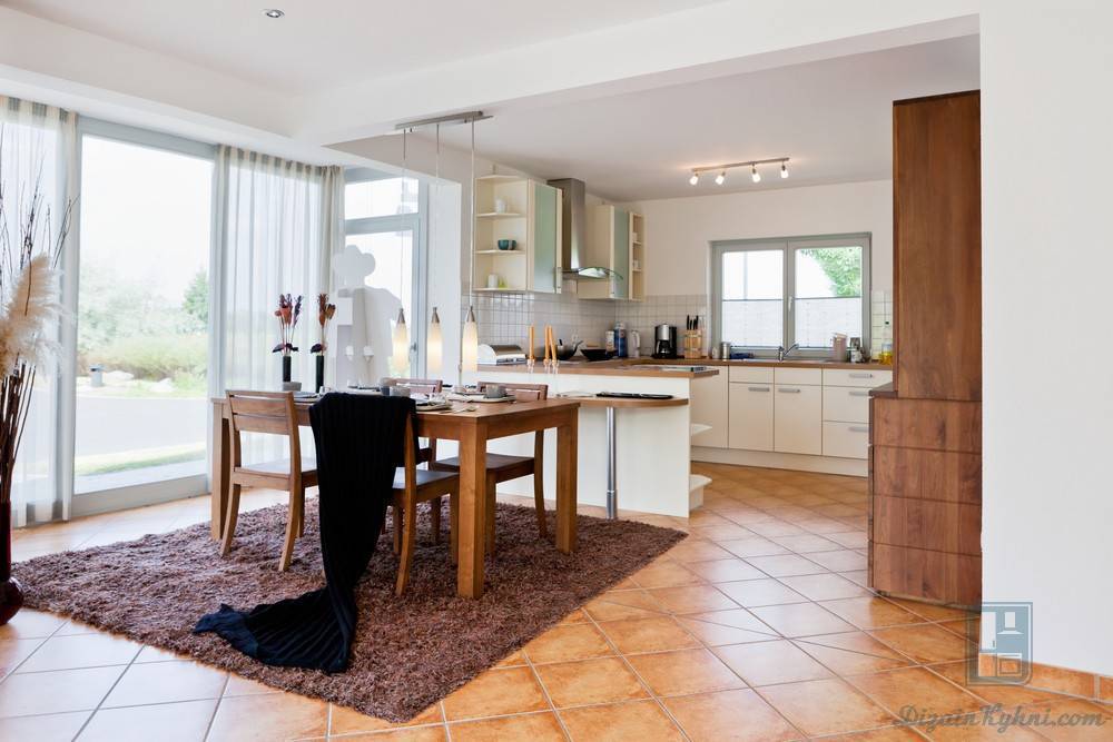 В обеденной зоне ковер может быть практически любым — круглым, овальным, квадратным, прямоугольным. Цвет и материалы также выбирайте на свой вкус и с учетом дизайна кухни.