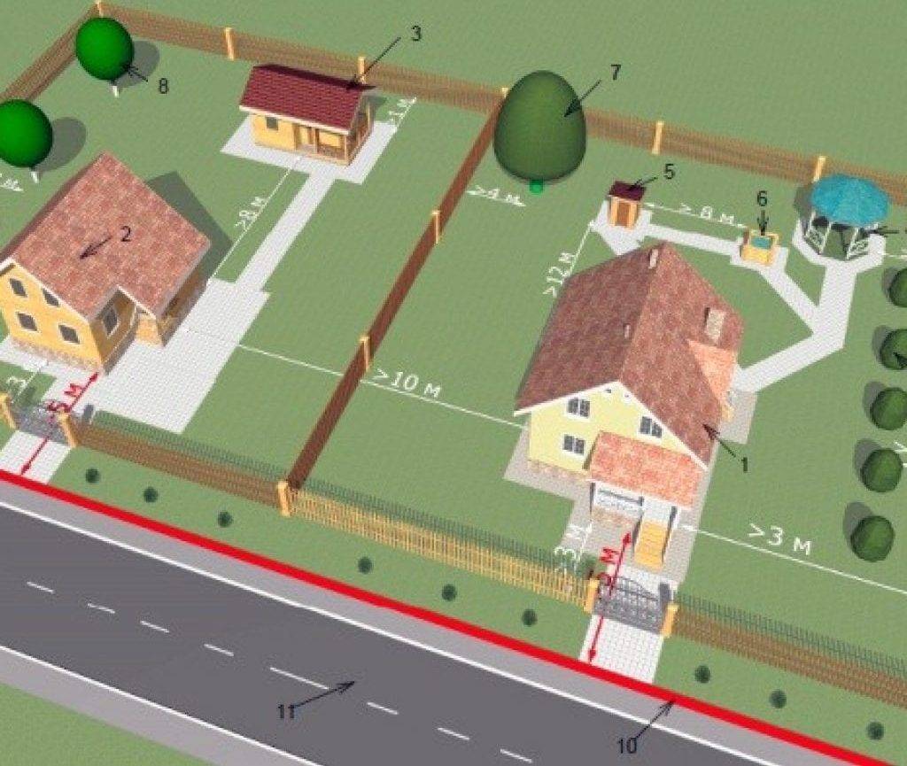 Согласно санитарно-бытовым требованиям, предусмотренным СП 53.13330.2011, расстояние от забора до различных объектов следующее: