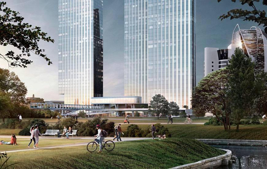 Судя по названию и местоположению, может показаться, что три башни, высотой в 61 этаж, рядом с парком “Красная Пресня” – это продолжение проекта “Москва Сити”, ведь застройщик Capital Group уж возвел башню “ОКО”, а теперь презентовал этот проект. Он совсем еще зеленый, его анонсировали осенью этого года, а сдача башен запланирована на 3 квартал 2020 года, сейчас продажи еще не начались. Главная концепция – сочетание мегаполиса и природы. Стиль башен Park Tower, City Tower, River Tower застройщик относит к “роскошному минимализму”: фасады домов из платинового стекла и белой стали, площадь этажей предельно уменьшена. На три башни здесь будет 524 квартиры и 307 офисов, подземная парковка на 1415 машиномест. Приятный бонус – у жителей башен будет собственный выход в парк “Красная пресня”.