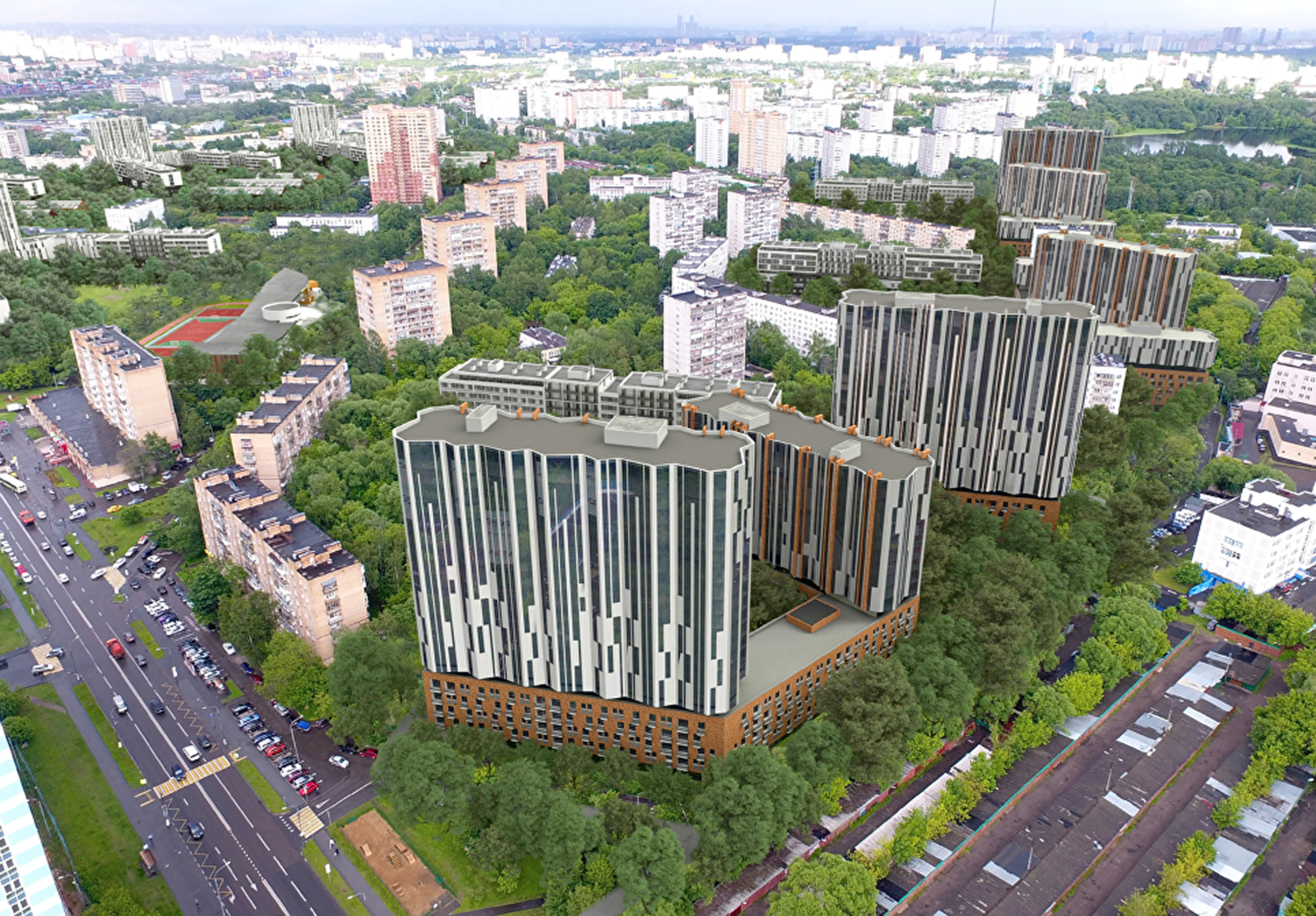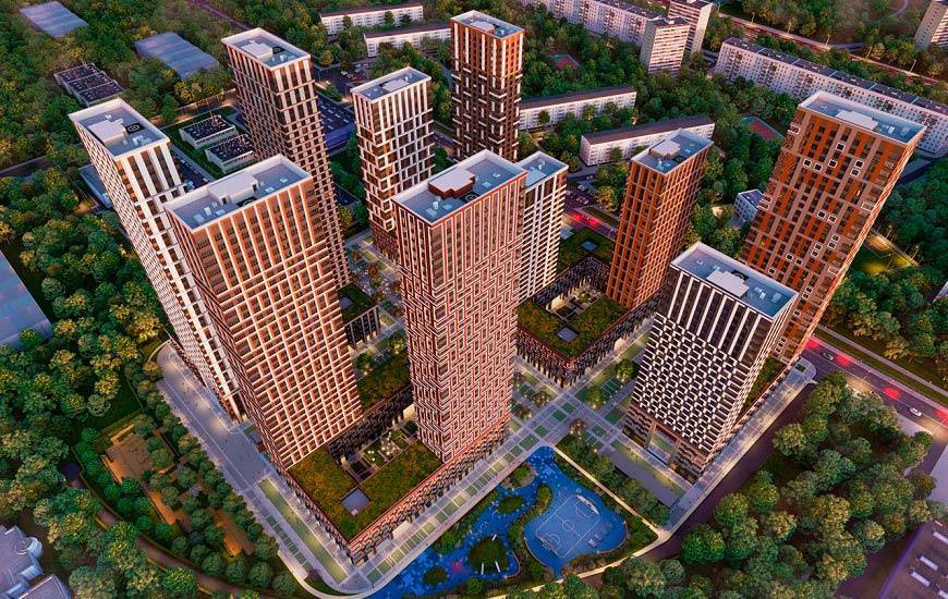 На Северо-Востоке Москвы в районе Гольяново возводятся башни комплекса комфорт-класса “Level Амурская”, максимальная высота здесь – 39 этажей, срок сдачи намечен на 3 квартал 2019 года. В отделке используется привычный клинкерный кирпич и навесные фасады. Двор закрыт для машин, там разместилась многоуровневая прогулочная зона.