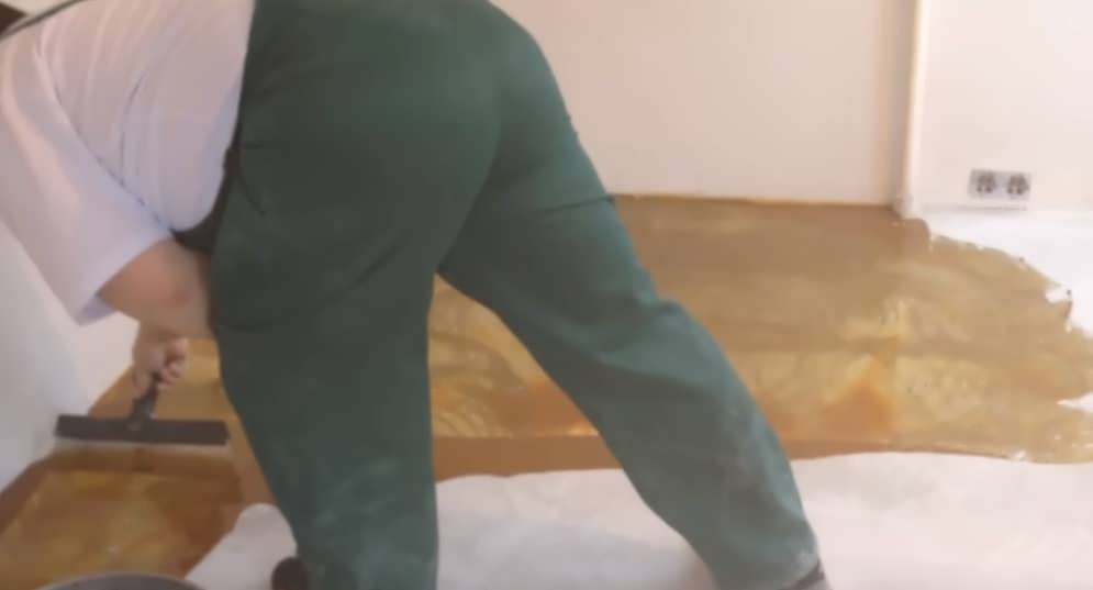 Готовый раствор выливают на основание, разравнивают и при помощи игольчатого валика удаляют из него весь воздух. Для его полной полимеризации понадобится не менее 24 часов, а для полного высыхания — неделя.