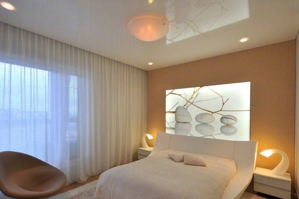 Глянец визуально увеличивает площадь комнаты, поэтому является оптимальным выбором для маленьких компактных спален. Придать воздушность конструкции позволит подсветка в виде точечных устройств или светодиодной ленты. Чаще всего они располагаются по контуру покрытия и дополняются бра, встроенными в стену у изголовья кровати или настольными лампами.