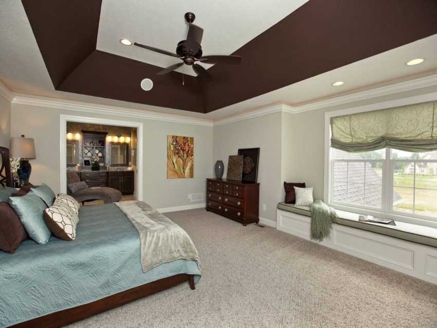Вы можете использовать многоуровневый подвесной потолок. Углубление можно интересно подчеркнуть с помощью светильников. Дизайн двухуровневого потолка в спальне должен иметь преобладающие нейтральные цвета.