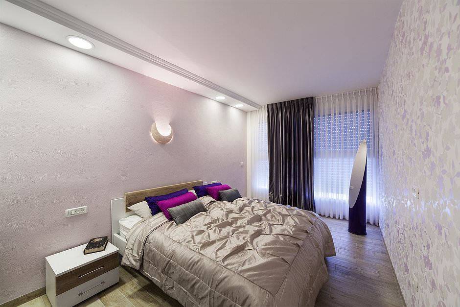 Освещение натяжных потолков в спальне желательно делать приглушенным, регулируемым по яркости при помощи небольших светодиодных светильников, не следует устанавливать на нем большие осветительные приборы.