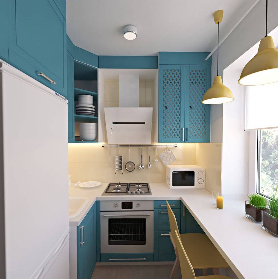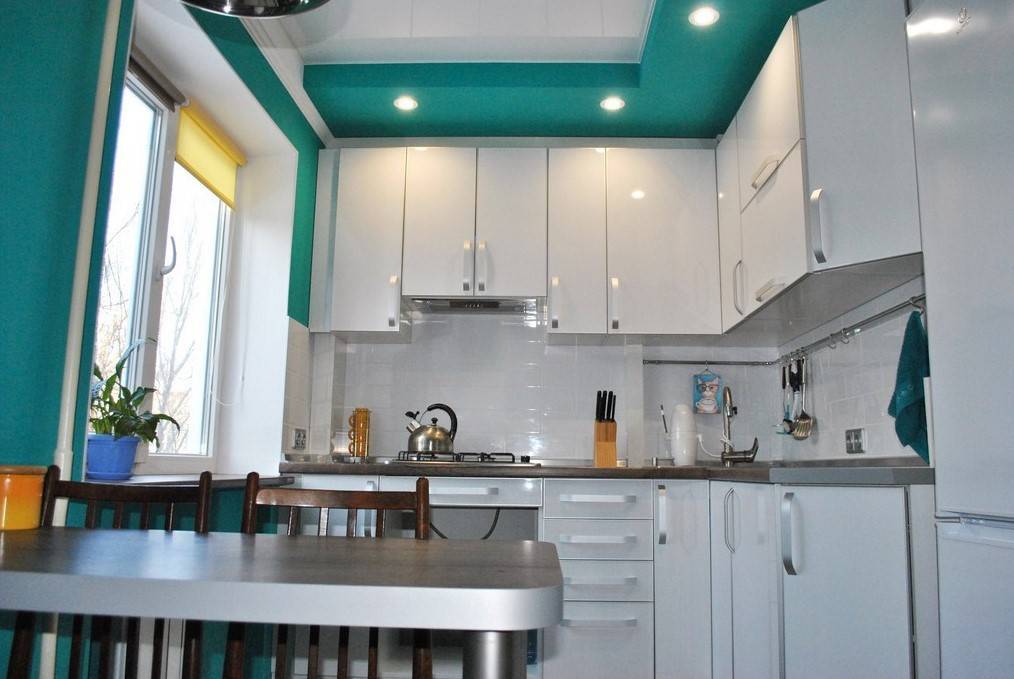 В кухнях с небольшой площадью натяжные потолки могут стать хорошим инструментом для расстановки декоративных акцентов.