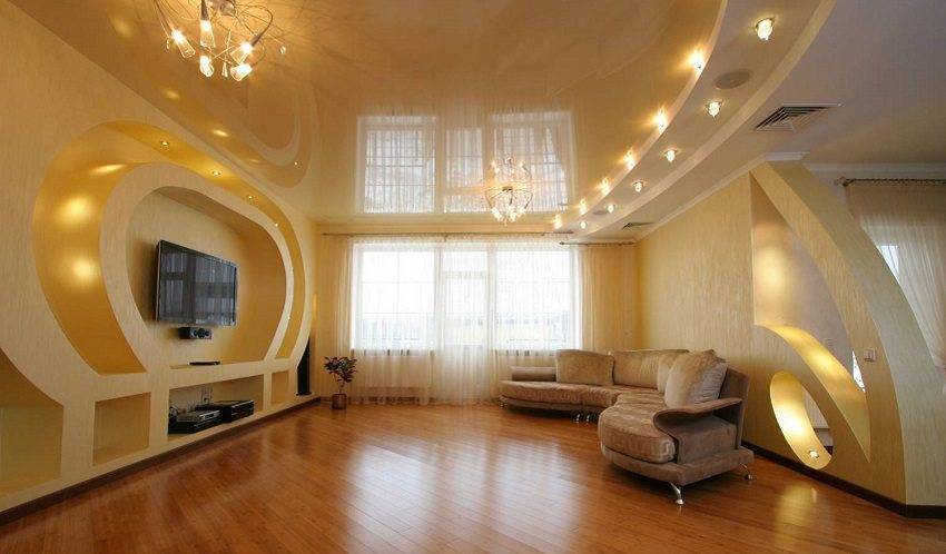 Дизайн натяжных потолков в гостиной: фото готовых примеров в интерьерах разных стилей