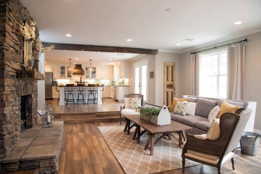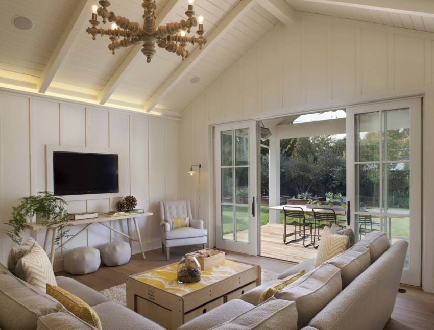 Большая по площади гостиная, с высокими потолками, нуждается в установке большего количества световых приборов или грамотного встраивания их в потолок.