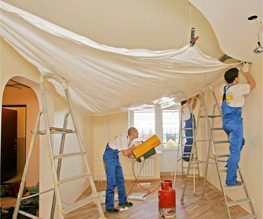 - помещение с помощью тепловой пушки или горелки прогревают до 40-градусной температуры и разворачивают полотно верхнего яруса потолка. Его нагревают до 60 градусов;