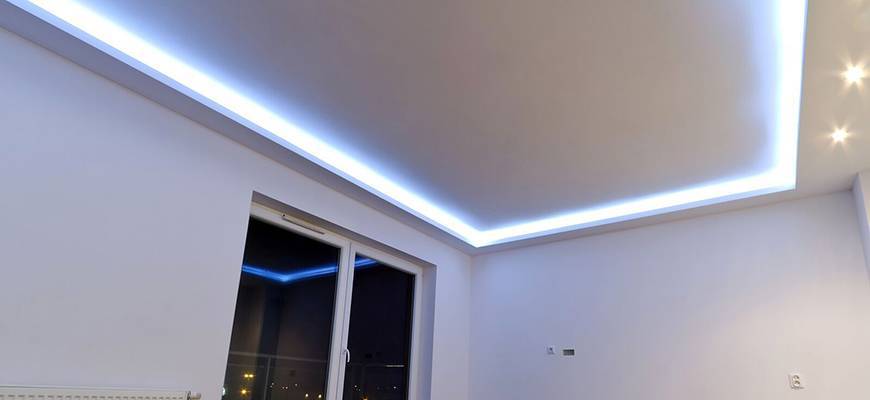 В настоящее время для натяжных потолков используются светодиодные источники света, специальные светящиеся ленты. Такие светильники потребляют относительно небольшое количество электроэнергии. Если вы выбираете для своего потолка установку светодиодной ленты в качестве встроенной яркой подсветки в зале, то помните, что для такого источника света необходим особый блок питания (драйвер), размещающийся в доступном месте. Светодиодные светильники способны прослужить максимально долго. Наиболее удобными и практичными считаются такие лампы низковольтного типа.