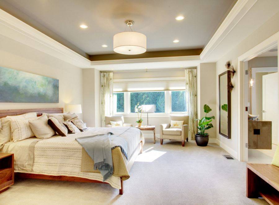 При выборе ламп для потолка спальни следует помнить, что полотна АВХ натяжных потолков и гипсокартон не должны нагреваться.